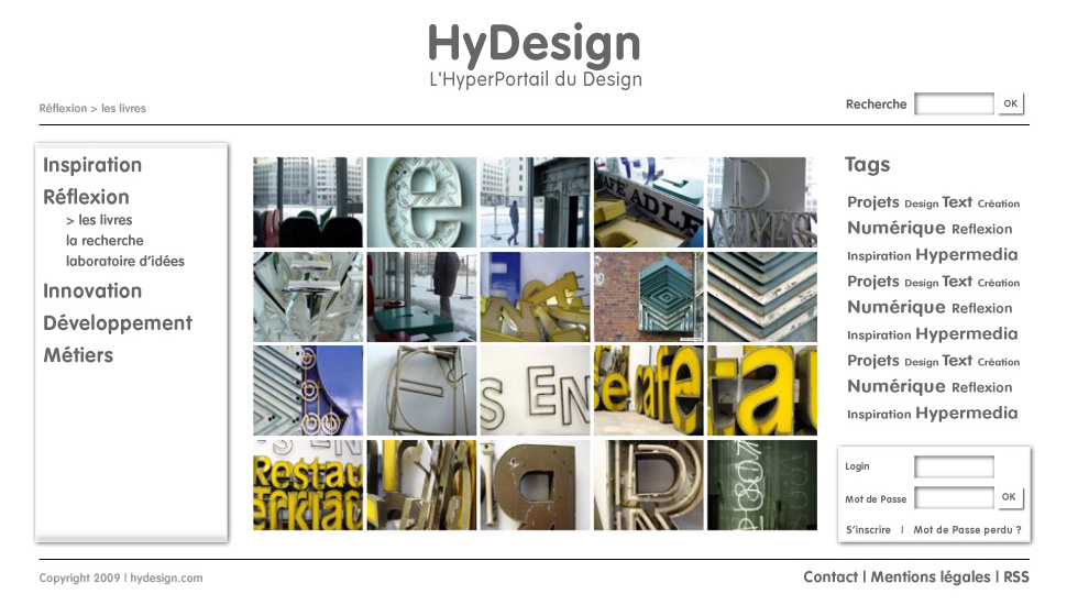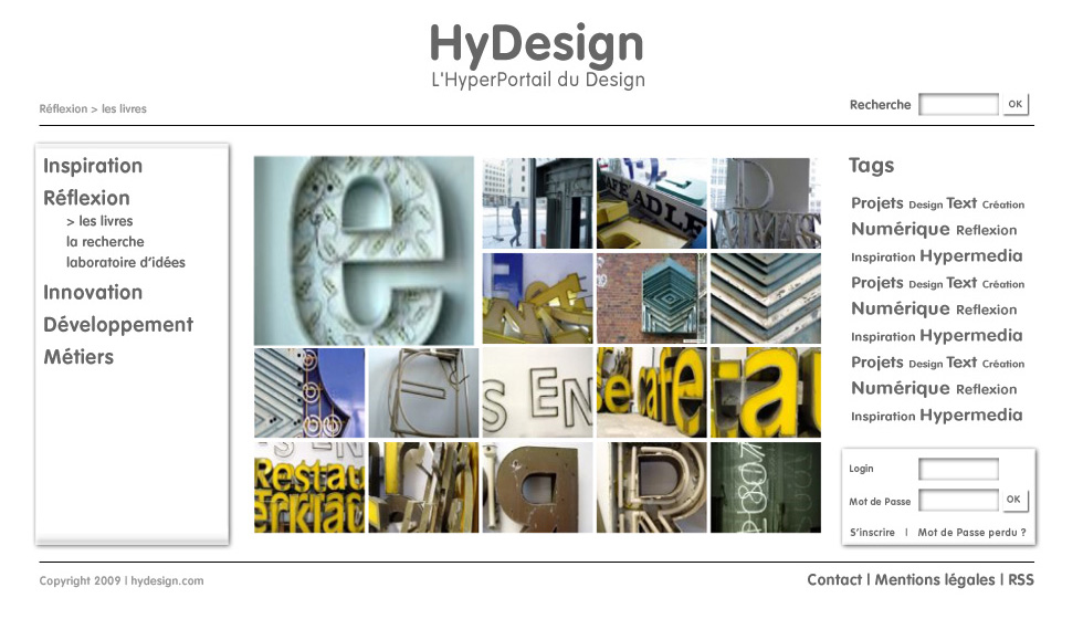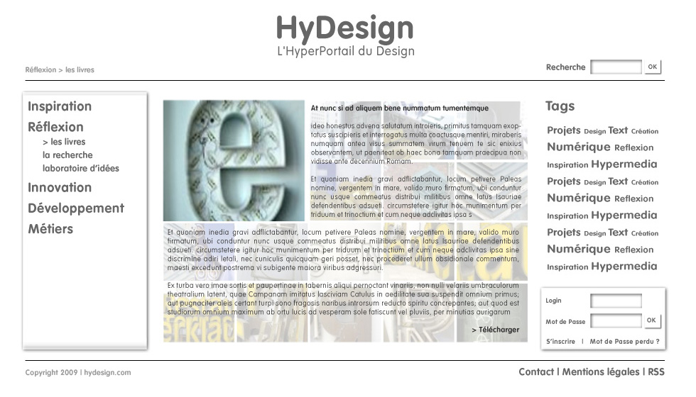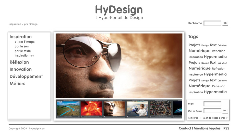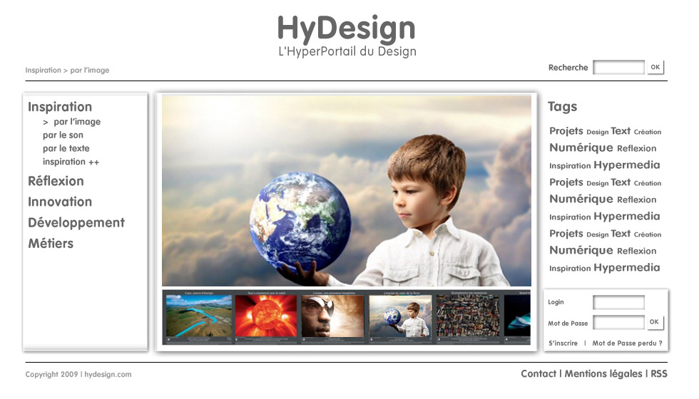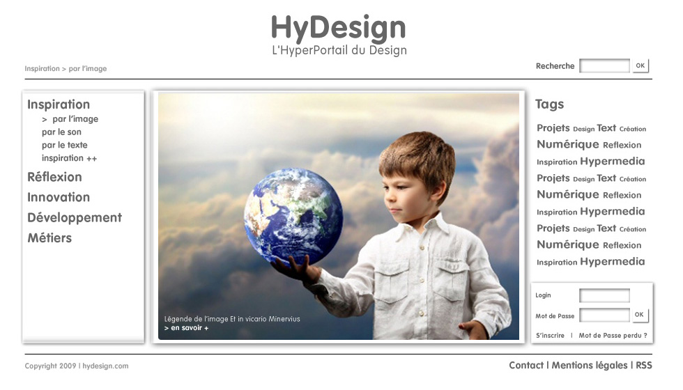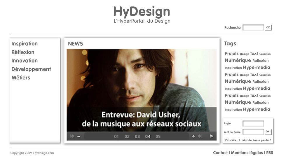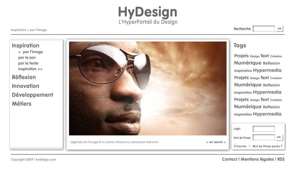 Le projet HyDesign est un projet de site Internet destiné aux personnes intéressées par le design et la création numérique, que ce soit les artistes, les infographiste ou les développeurs mais aussi les néophytes qui chercheraient une source d’inspiration ou tout simplement un internaute qui regarderait ce qui se fait dans ce domaine. Ce site doit être la rencontre de plusieurs rubriques traitant de la création numérique et des technologies web utilisées pour concevoir des objets hypermédia, mais aussi des informations généralistes susceptibles d’intéresser tout individu « surfant » sur Internet.